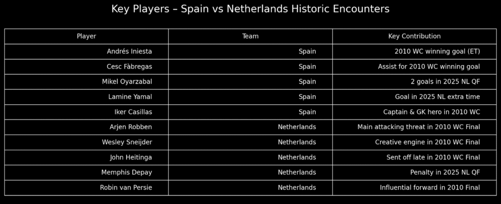 Some of the biggest moments between Spain and the Netherlands, especially in the 2010 FIFA World Cup Final and the 2025 UEFA Nations League clashes, we have these star performers.
